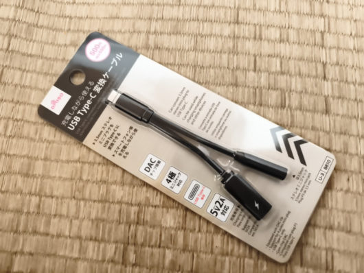 一つ残念なのが、最近のスマホにはありがちなイヤホンジャックおよび、本体でFMラジオが聞けないというところです。ラジオについては先日持ち歩き用のラジオを手に入れているので問題ないですが、スマホに有線イヤホンを強引に付けられるようにするため、充電しながら有線イヤホンを使える変換ケーブルをダイソーで550円で購入しました。