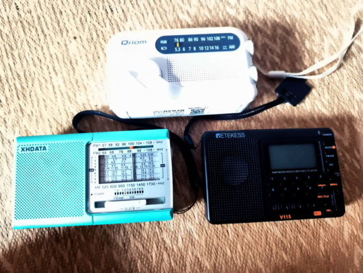 海外旅行に行く場合、念の為このラジオを予備として持っていく可能性は高いですが、操作がかんたんではあるものの、ちょっとしたことでダイヤルがずれると、アナログラジオのように聞こえ続けないでいきなり放送が切れてしまいます(それが1か0かのデジタルの特長であるわけなのですが)。それでも、ラジオ単体で使うにした場合2千円くらいで海外でも使えるラジオは便利なので、このラジオを一軍とせて使っていたのですが、今回また交代となりました。改めて3台のラジオを並べてみました。上がYTM-R100、下の向かって左がD-219、右がV115です。本体の厚さはYTM-R100が際立って厚く、V115は薄くて小さくて軽いという特長があります。