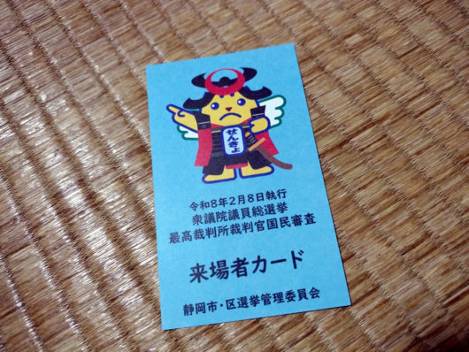 昨日、祝儀金選挙の期日前投票に行ってきました。投票所入場用のハガキはすでに先週末に着いていたのですが、2月に入らないと国会議員選挙とともに行なわれる最高裁判所裁判官国民審査を同時に行なうことができないということだったので、月変わりを待って行ってきました。と、書いても「本当に投票したのか?」と問われればそれを証明することはちょっと難しいのですが、投票出口に「来場者カード」が並んでいまして、欲しい人は一枚持って行ってよいということだったのでもらってきました。
