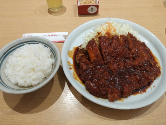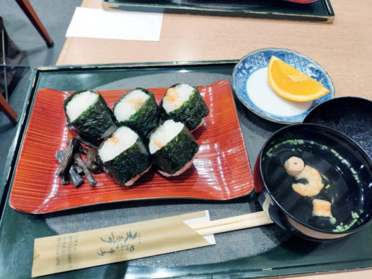 まず訪れたのは地下鉄矢場町から直結の松坂屋のデパ地下で、「天むす 千寿」の天むすセットをいただくことに。ランチタイムは少しはずしていたものの、お店の席数が少ないので2~3組先客がいて少し待ってから入りました。メニューは基本的に天むすセットの一種類のみで、小さな天むす5個というちょっと足りないかな? という感じですが、実はそこは十分計画の上です。