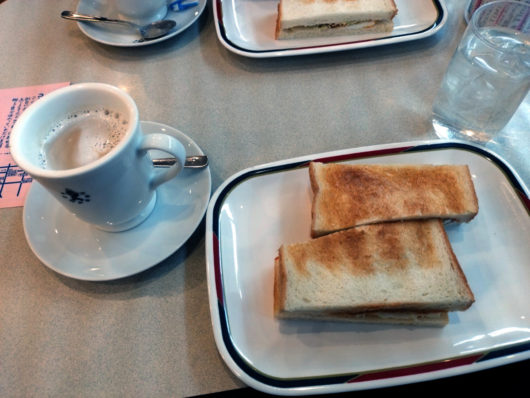 開店の8時ぐらいに入ったのですが、年配の方を中心にさっと席が埋まっていき、ウィークデーということもあってか一人で訪れる方が多かったです。そのほとんどがコーヒーを注文していましたが、少しカフェオレを頼んで後悔しかけたものの、カップの大きさは小さかったので、歴史ある抽出されたコーヒーの味を求めてやってきているのかな? とも思えます。この辺は良く知らないまま注文してしまったので今もってどちらが良かったのだろうと思えます。この他にも後で調べたら多くの喫茶店があったので、自分に合ったモーニングメニューを出してくれるような喫茶店を探すのも良いかも知れませんね。