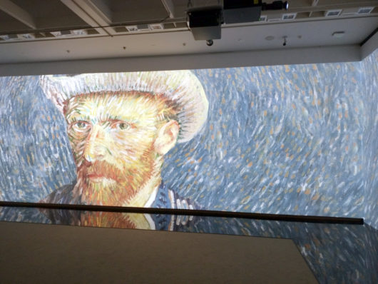 そして出口の直前に、展示室の壁一面を使ってのプロジェクションマッピングがあり、こちらの方は撮影してネットに上げることも可能ということだったので、スマホで写真を撮ってきました。実際にはその場所に行かないとその臨場感はまるで違いますが、何せ大きな画面にゴッホの作品や実際の風景が投影されるのは圧巻でした。その後、ミュージアムショップに入っておみやげなどを物色し、今回の目的であったゴッホ展訪問は終了しました。